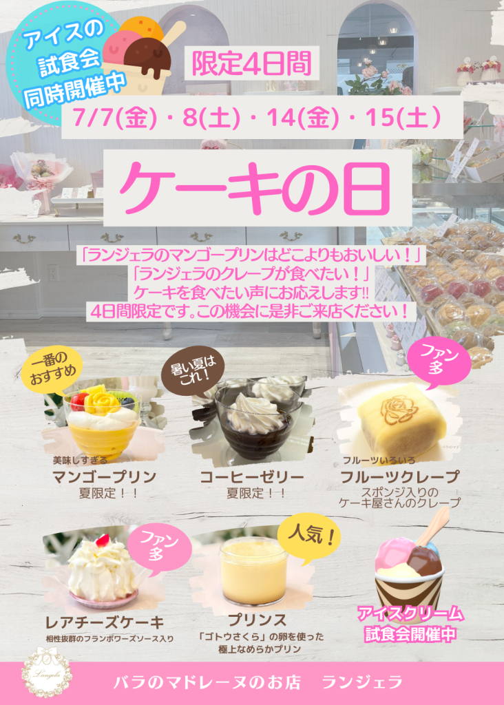 「ランジェラのケーキが食べたい」との声にお応えして、7月7日(金)、8日(土)、14(金)、15(土)の4日間、プチガトーの特別販売をいたします。